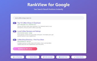 RankView สำหรับ Google เป็นส่วนเสริมของ Chrome ที่ช่วยให้ผู้ใช้สามารถดูตำแหน่งผลการค้นหาแบบเรียลไทม์โดยตรงบน Google เครื่องมือนี้มีประโยชน์โดยเฉพาะสำหรับผู้เชี่ยวชาญด้าน SEO ผู้สร้างเนื้อหา และผู้ที่สนใจติดตามอันดับเว็บไซต์ของตน ด้วยฟีเจอร์ที่ไม่เหมือนใครในการแสดงป้ายหมายเลขข้างผลลัพธ์ที่เป็นธรรมชาติ ผู้ใช้สามารถเห็นได้ทันทีว่าเว็บไซต์ของตนอยู่ในตำแหน่งใดโดยไม่ต้องใช้เครื่องมือเพิ่มเติม ส่วนเสริมนี้ออกแบบมาให้ทำงานแบบออฟไลน์และรับประกันว่าไม่มีการเก็บข้อมูล โดยให้ความสำคัญกับความเป็นส่วนตัวของผู้ใช้